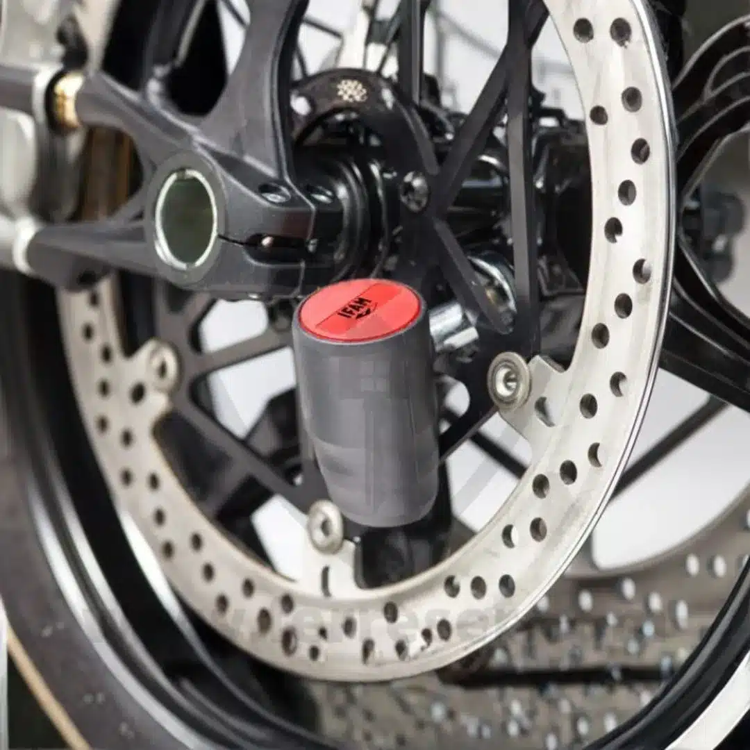 Este antirrobo combina un cuerpo de acero templado con un pasador cromado de gran diámetro (tipo seta) que aporta una sujeción sólida sobre el disco de freno. La carcasa exterior incluye protección para minimizar roces sobre llantas y componentes cercanos, y la cerradura de disco incorpora tapa protectora frente a humedad y suciedad, un detalle clave para mantener el funcionamiento suave con el paso del tiempo.